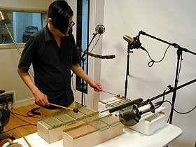 「これは何かというとガラス琴です。ガラス琴っていうのは、木琴とか鉄琴とか色々ありますけど、ガラス琴です。これは幅が8センチくらいのガラスの板でございます。クルクルってハンドルを回すとブラインドのように開く、ルーバーガラスというお風呂場、洗面所に多く使われるガラスの1枚ですね。その長さが色々ありまして、それを日本酒が入っていた桐の箱でしょうかね、その箱の上に扉用スポンジ・テープ、これは廃品ではありません。100円ショップとかでも売っているので買ってください(笑)。箱とガラスの接点のところにスポンジの役目として置くわけですね。で、そうすると鳴るわけなんですけど、ガラスは持って鳴らすと音が響きません。宙に浮かせると、浮いている間だけ音が響くんですけど、ずっとこうやって演奏しているわけにもいかないので、この箱の上に載せて叩くと響くわけですね。この箱の中に音が響くわけですね。