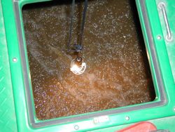 最初沈殿池。見学用にフタをあけて、中を見せてくれる。確かに汚水!? | |